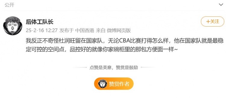 媒体人@后体工队长发微博对此发表看法,他写道:“我反正不奇怪杜润旺留在国家队,无论CBA比赛打得怎么样,他在国家队就是最稳定可控的空间点,品控好的就像你家碗柜里的那包方便面一样~”