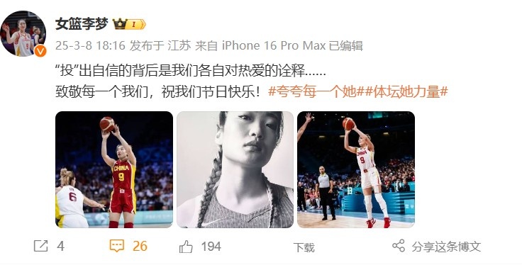 3月8日讯 今日,中国女篮球员李梦更新社媒,晒出了一组照片。