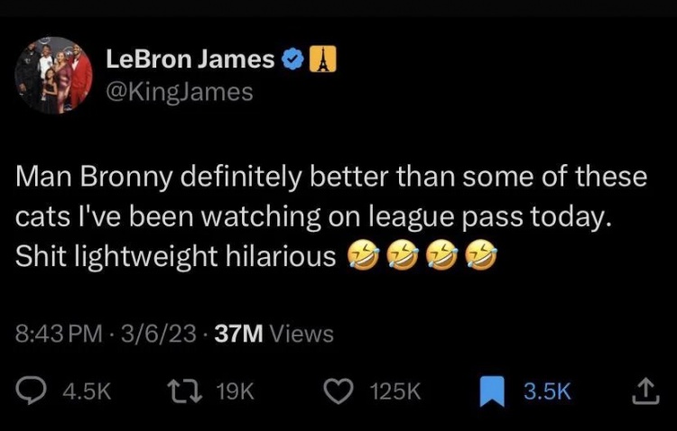 在2023年3月6日,詹姆斯发推写道:“天啊,布朗尼绝对强于今天我在联盟通(注:NBA官方比赛直播服务)上看到的一些阿猫阿狗。这场面真的有点好笑????????????????”