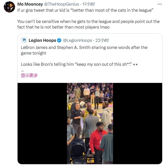 而BBC记者Mo Mooncey近日在点评詹姆斯与A-史密斯对峙事件时批评詹姆斯说:“如果你发推说你的儿子‘比联盟大多数的阿猫阿狗更强’,那当你儿子进入联盟之后,人们开始指出他并没有比大多数球员要强的事实时,你就不能如此敏感。”