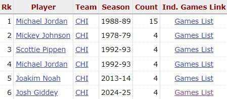 据统计,这是基迪本赛季第4次三双,单赛季4次三双,并列为队史第2多,仅次于88-89赛季乔丹的15次。