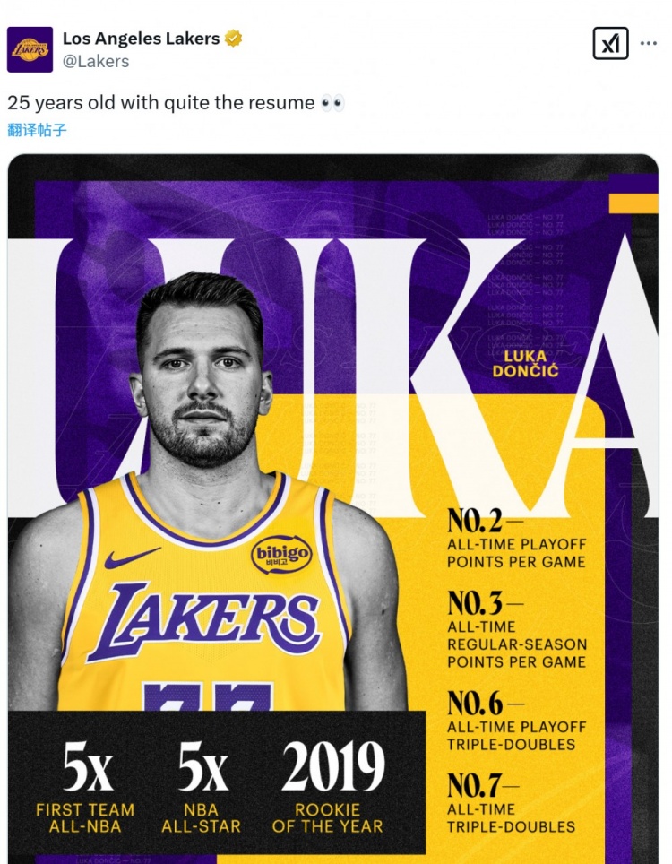 25岁!湖人晒东契奇履历:5次一阵&5次全明星 季后赛场均30.9分 湖人官方晒东契奇履历:“年仅25岁,履历丰富????。”5次一阵、5次全明星、2019年年度最佳新秀生涯季后赛场均得分(30.9)历史第2生涯常规赛场均得分(28.6)历史第3季后赛三双数(10次)历史第 2025/02/04
