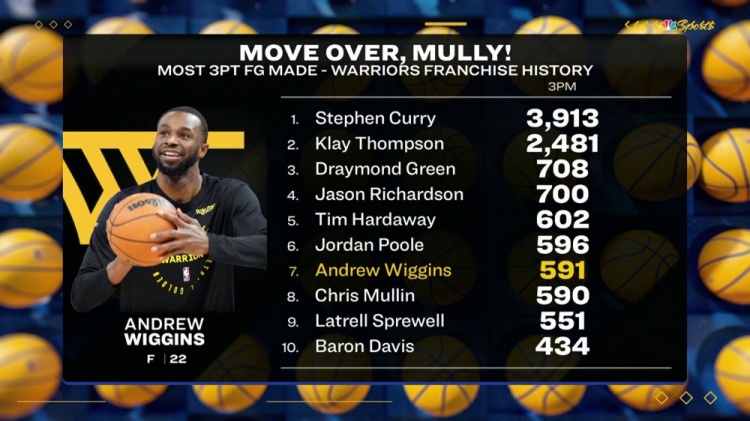 勇士队史三分命中数前十:水花兄弟断档前2 追梦第3 普尔第6 2月4日讯 NBA常规赛,勇士104-99击败魔术。本场比赛,勇士前锋维金斯打了35分钟14投7中,三分5中1、罚球15中10拿到全队最高25分外加2篮板2助攻,正负值+15。据统计,本场过后维金斯升 2025/02/04