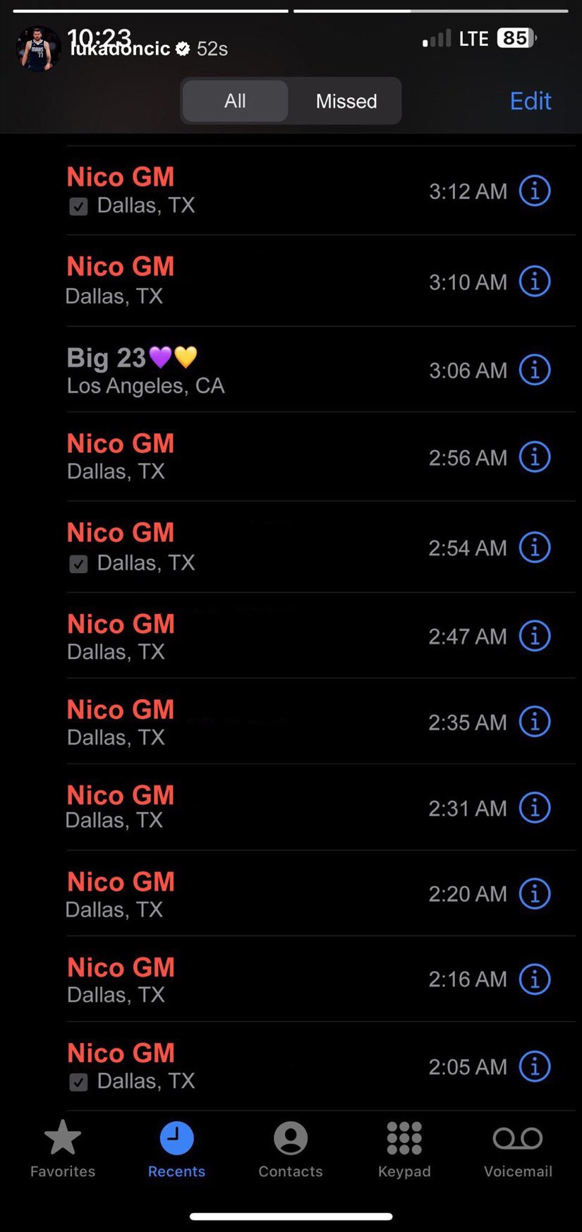 网传独行侠GM连打10个电话都被东契奇拒接☎️但77接了老詹的电话 02月03日讯 昨日NBA诞生一笔历史级重磅三方交易,东契奇和浓眉互换东家。网传被送去湖人的东契奇在社媒上晒出自己的通话记录,独行侠总经理兼运营总裁哈里森连打10个电话他都没接,但接了新队友詹姆斯的电 2025/02/03