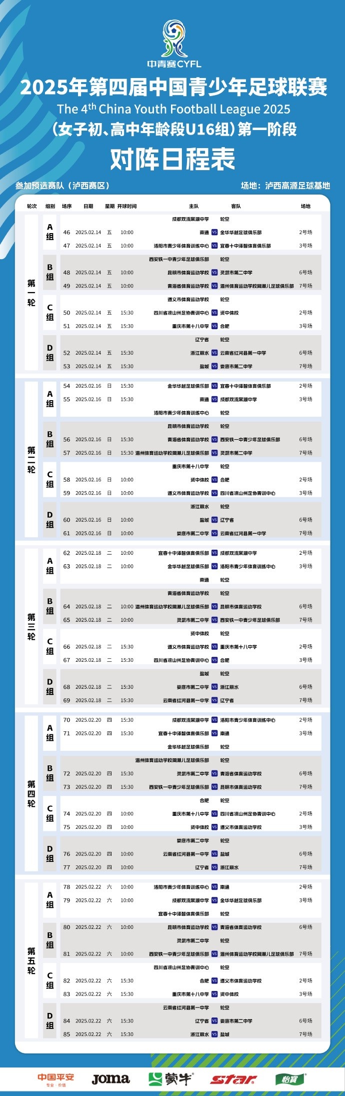 2025年第四届中国青少年足球联赛(女子初、高中年龄段U16组)第一阶段竞赛日程公布