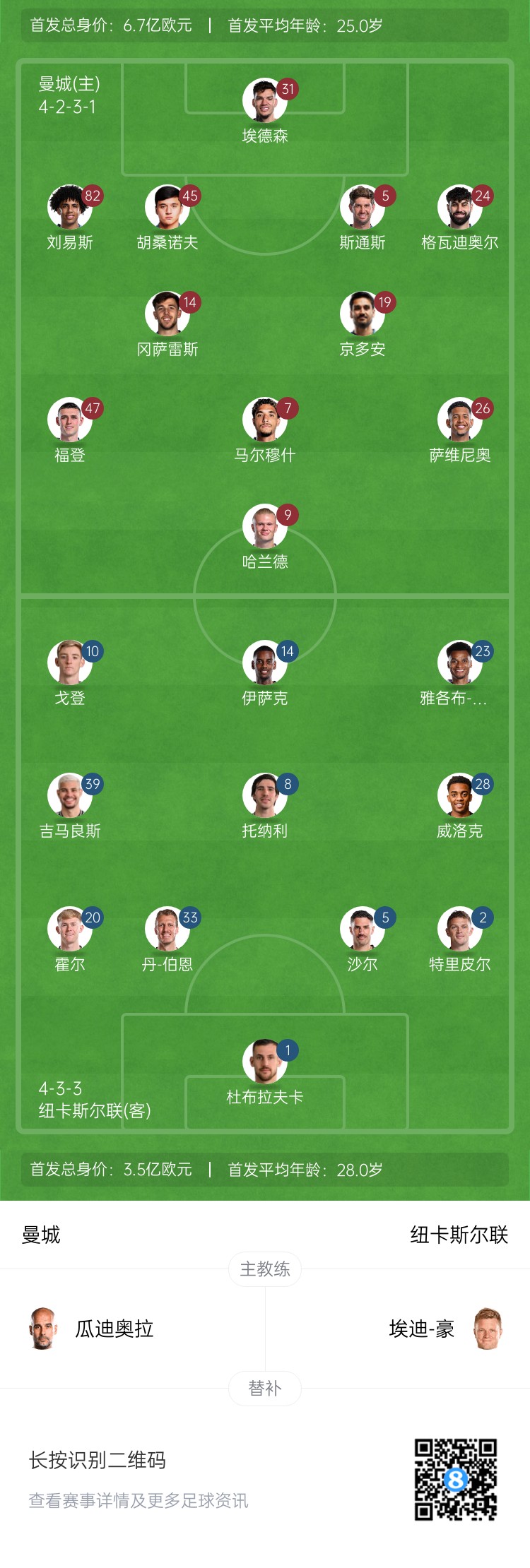 曼城vs纽卡首发:哈兰德、京多安先发,胡桑诺夫、刘易斯出战