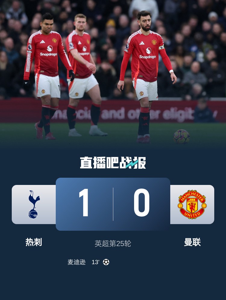 英超第25轮,热刺主场1-0曼联,麦迪逊制胜,加纳乔失良机。