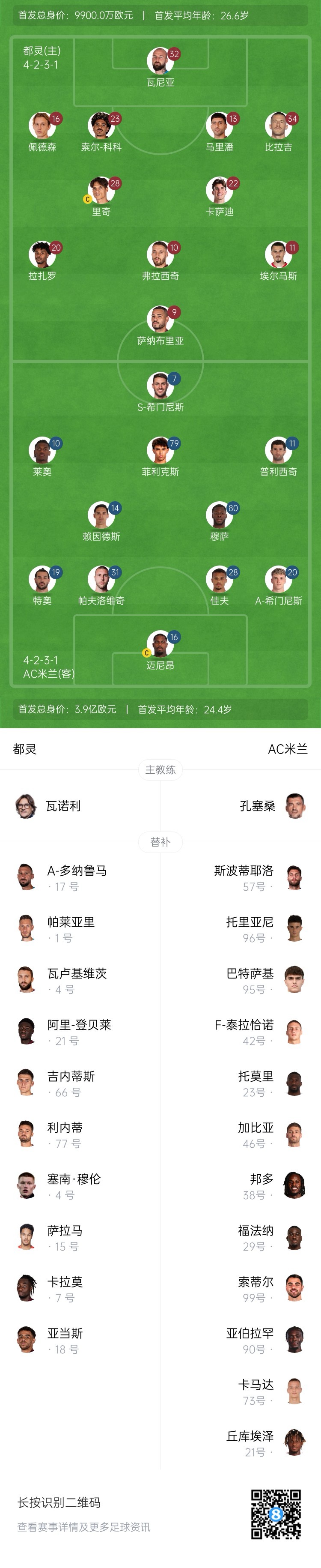 米兰首发:16-迈尼昂、20-A-希门尼斯、31-帕夫洛维奇、28-佳夫、19-特奥、80-穆萨、14-赖因德斯、11-普利西奇、79-菲利克斯、10-莱奥、7-S-希门尼斯