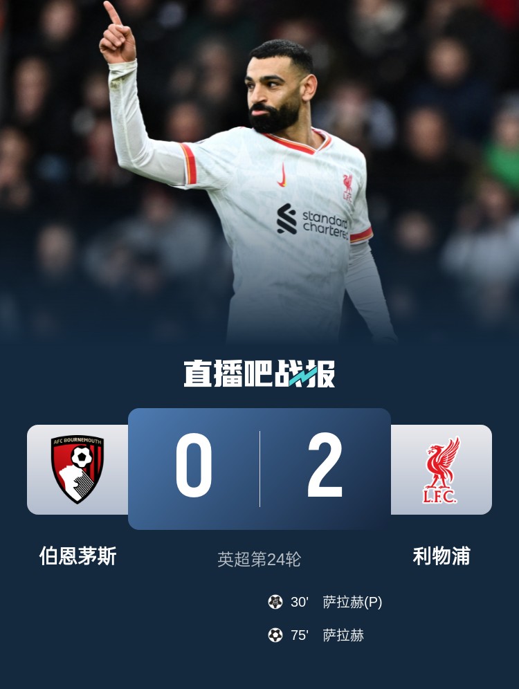 萨拉赫梅开二度,利物浦2-0战胜伯恩茅斯,9分领跑积分榜。