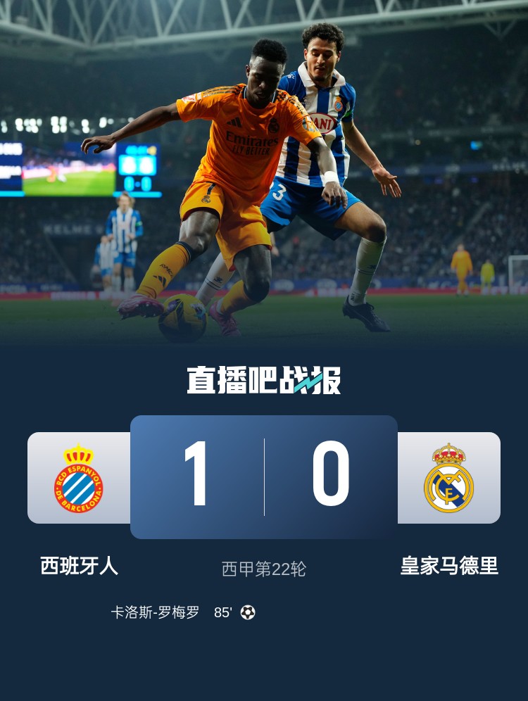 罗梅罗第85分钟绝杀,皇马0-1西班牙人,只有1分领跑积分榜。