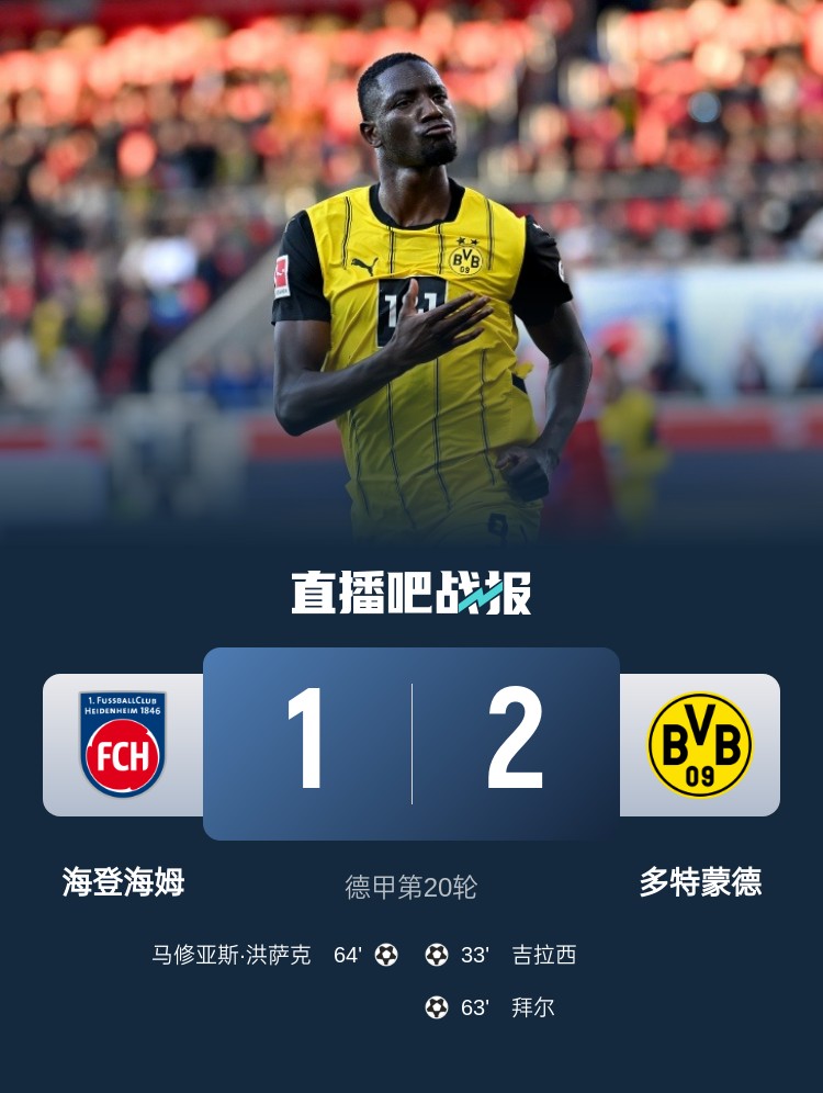 终结联赛4轮不胜!多特客场2-1海登海姆 吉拉西拜尔破门
