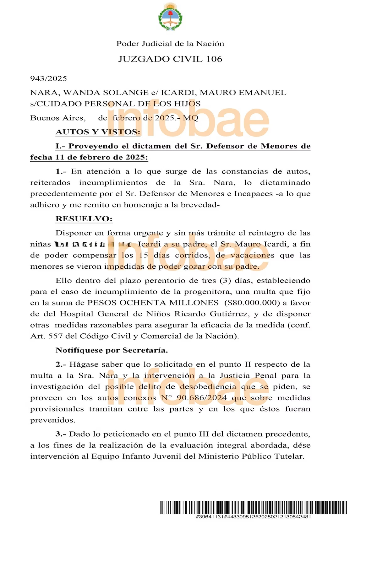 阿媒Infobae报道,法院做出了有利于伊卡尔迪的裁决,旺达需要在三天内归还两个女儿,否则将面临罚款。