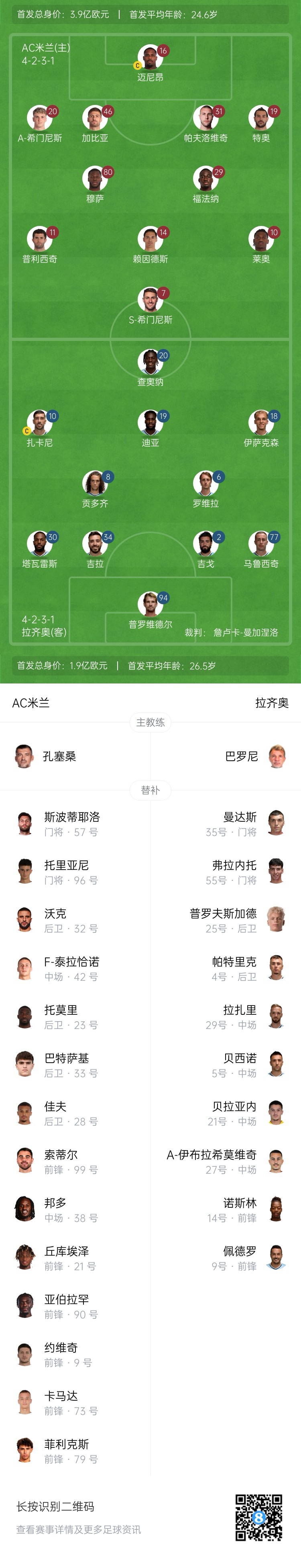 米兰首发:16-迈尼昂、20-A-希门尼斯、46-加比亚、31-帕夫洛维奇、19-特奥、80-穆萨、29-福法纳、11-普利西奇、14-赖因德斯、10-莱奥、7-S-希门尼斯