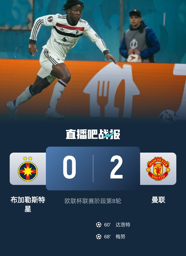 梅努传射,达洛特破门,曼联2-0击败布加勒斯特星,排名第3直接晋级欧联杯16强!