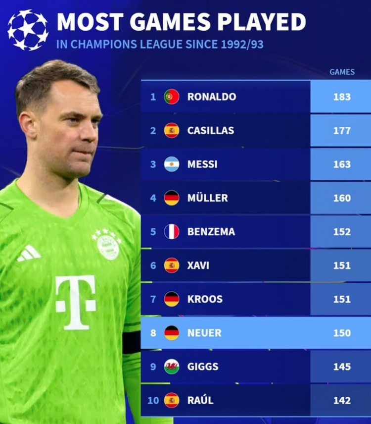 3月6日讯 拜仁在昨晚欧冠焦点战3-0完胜勒沃库森,诺伊尔首发解锁个人150场里程碑。《转会市场》统计显示他也是欧冠改制后出场榜第8位。