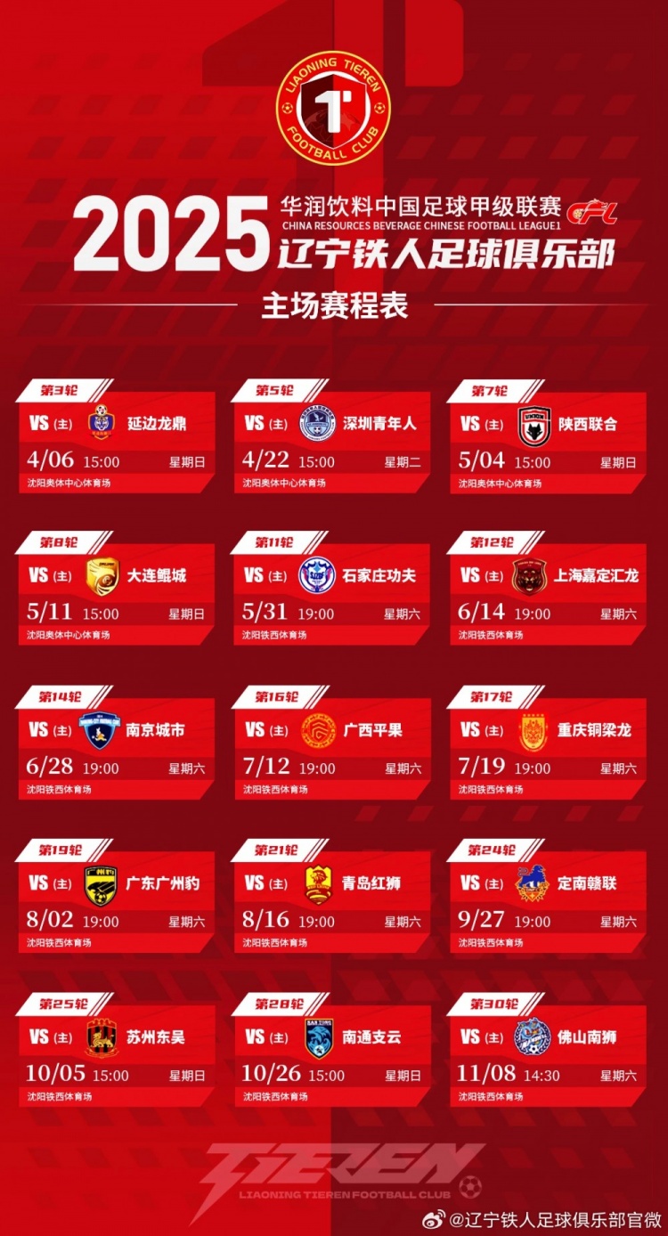 2025赛季辽宁铁人一线队大名单、主场赛程