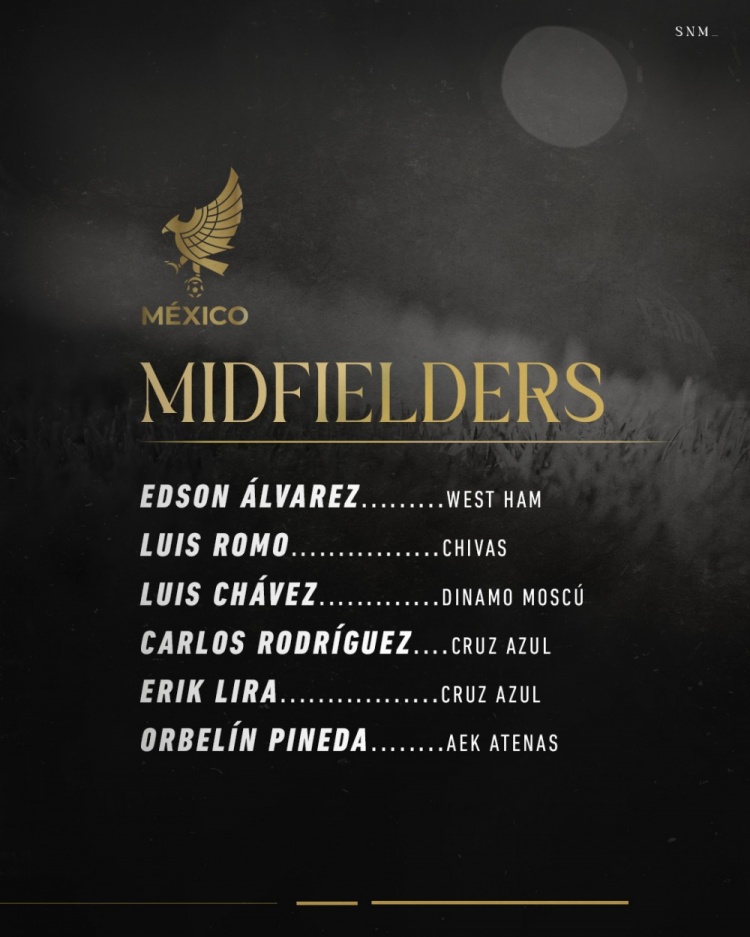 前锋:圣地亚哥-希门尼斯(米兰)、贝加(托卢卡)、劳尔-希门尼斯(富勒姆)、奎尼奥内斯(卡迪西亚)、阿尔瓦拉多(瓜达拉哈拉)、韦尔塔(安德莱赫特)、埃弗林-阿尔瓦雷斯(蒂华纳)