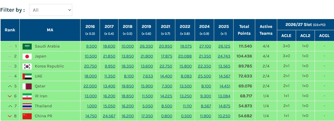 亚足联俱乐部技术分东亚区第3,2+1个亚冠精英联赛名额,1个亚冠2联赛名额