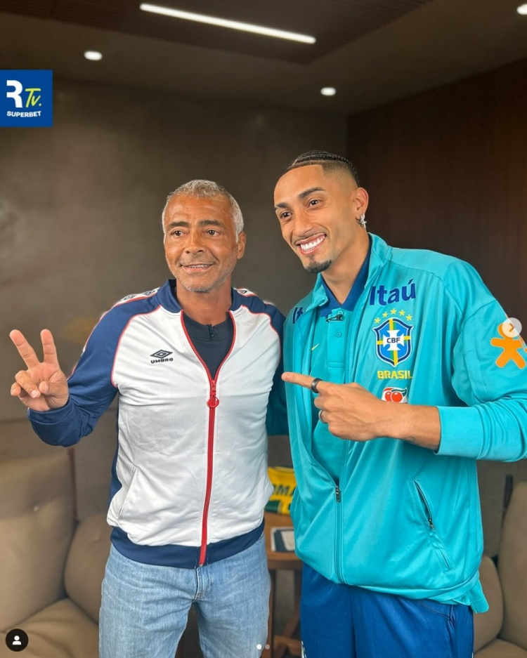 罗德里戈&拉菲尼亚&恩德里克做客电视节目,与罗马里奥合影留念
