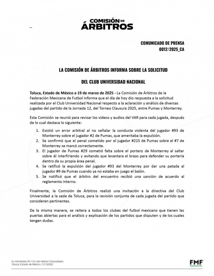 墨西哥美洲狮俱乐部赛后提出申请,希望墨西哥裁判委员会对比赛中的判罚做出澄清和分析,裁判委员会发布公告,确认当值主裁存在失误,拉莫斯上半场肘击对手就应该被罚下,但裁判没有对其出示红牌。