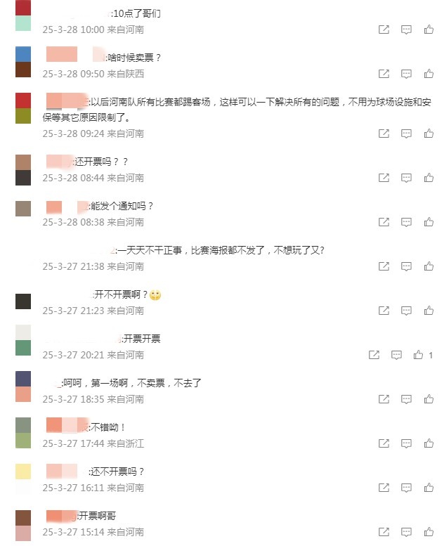 根据赛程安排,河南队将在本轮联赛主场对阵上海申花,比赛时间为3月29日(星期六)18:00。在赛前仅剩一天的时候,俱乐部仍未售票,也没有相关公告,这让球迷等得非常急迫。在河南队官方微博的评论区,球迷们在持续催促售票。