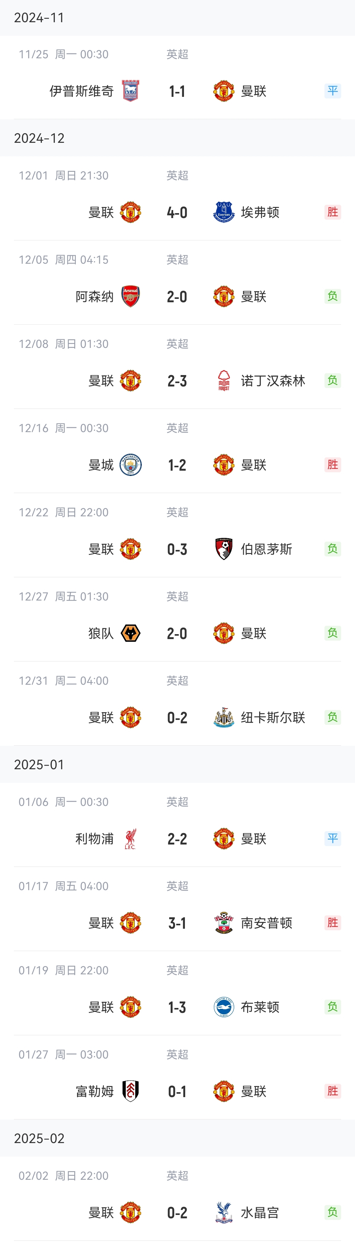 02月03日讯 曼联主场0-2完败于水晶宫,遭遇阿莫林带队以来的联赛第7败。