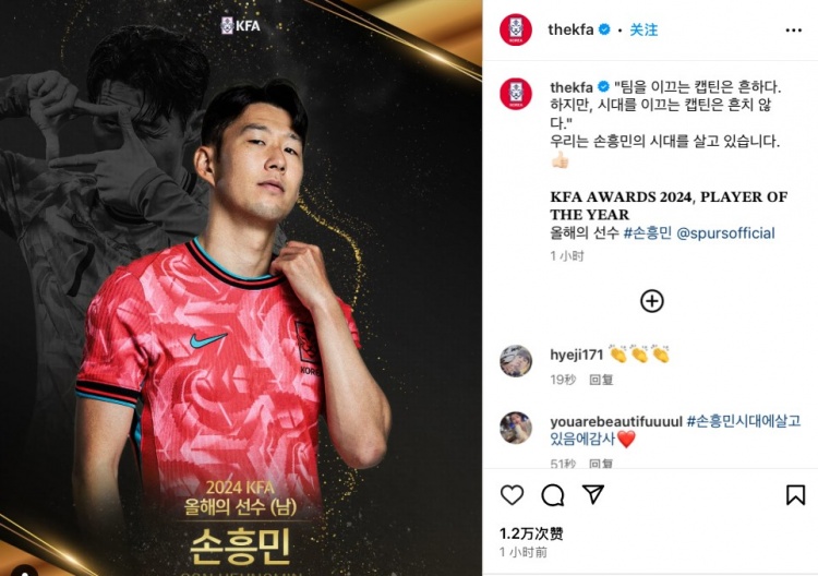 官方:孙兴慜当选韩足协2024年度最佳球员,第8次获得该奖项