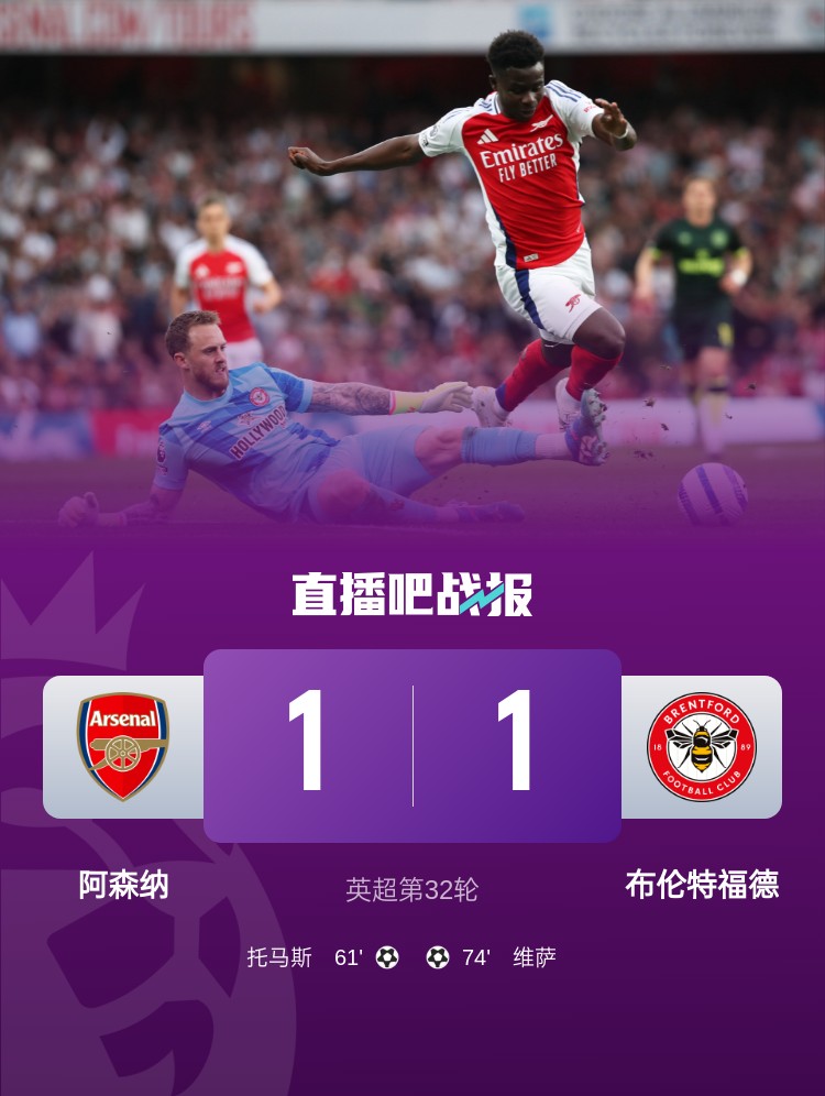 英超第32轮,阿森纳1-1布伦特福德,托马斯进球,赖斯助攻。