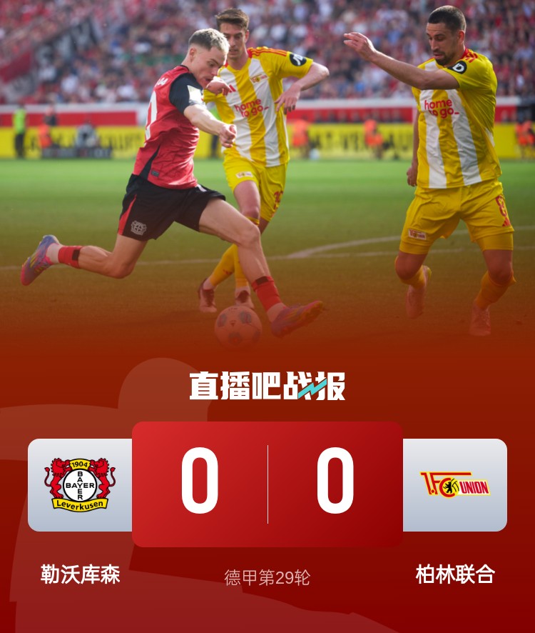 德甲第29轮,勒沃库森0-0闷平柏林联合。