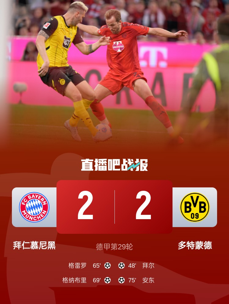 拜仁2-2多特6分领跑 格纳布里一条龙破门金玟哉漏人致丢球