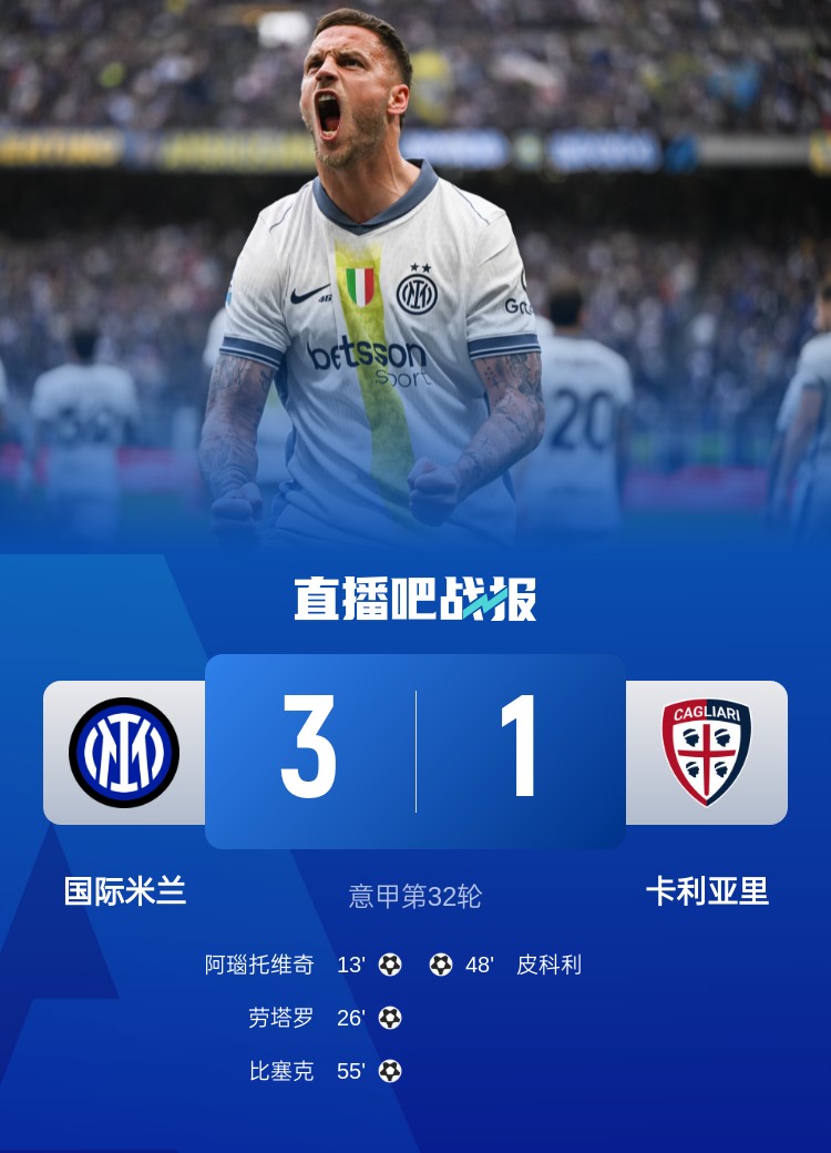 意甲第32轮,国米3-1卡利亚里,阿瑙托维奇传射,劳塔罗进球。