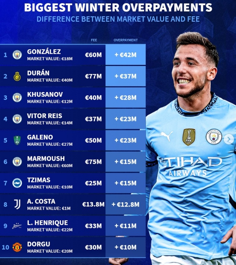 德转列冬窗溢价引援榜:前六曼城4将,杜兰、多古在列